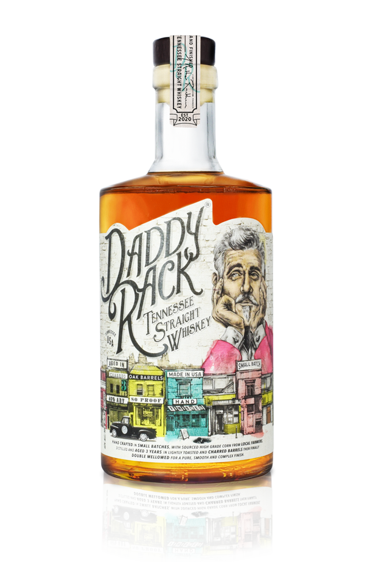 Created by Master Maker & Blender J. Arthur Rackham, aka Daddy Rack. All corn is sourced from local farmers close to the distillery with a mash of 80% Level 1 Corn, 10% Rye and 10% Malted Barley. After double distillation, the whiskey is filtered using the Lincoln County maple charcoal slow filtration process before maturity in new American oak barrels with a light char no.3.